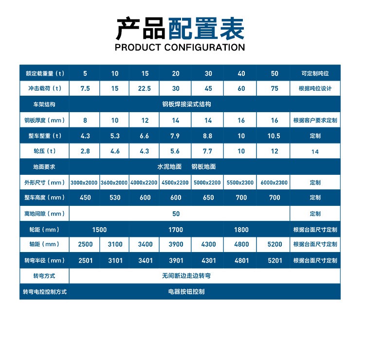 帕菲特技术支持 一对一量身设计规划产品方案,用户可在线咨询搬运车的配置问题,也可以到厂面对面沟通,方便我们为您提供更详尽的配置方案; 送货时,随车一名工程师,现场免费指导设备安装、调试、操作,让用户学会为止; 后期帕菲特为您提供终身售后保障,任何问题均可随时联系我们进行解决。 技术参数 型号:BWT 应用:车间运输 成品尺寸:可定制 载重:1-300T可定制 可选配件:胶轮、实心橡胶 轮、充气轮胎 主要配置:转盘、板簧、实心轮 胎、牵引环、牵引弹簧 根据您的工作需要定制产品 公司拥有强大的设计团队,可以承接各 种非常规与非标搬运设备的设计,解决客户 的搬运难题是我们公司一直努力在做的事情 佳 售后服务 1. 电动平车、轨道平车的承重安全系数不低于50% . 2、根据用户的具体情况,免费为用户设计辅助装置或基础图,井提供技术服务或图纸资料。免费为用户安装、调试直到安装、调试合格,达到用户, 3、公司的产品,实行"三包”服务。 4、在接到用户关于产品质量的来电、来函或口头通知后,售后服务人员一定在4小时内作出答复,48小时内赶到现场,紧急问题24小时内赶到现场。