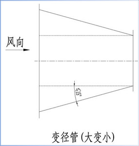 ⑻ 设备出入风口连接的变径管要尽量平顺,变径管(小变大)斜边与中心线夹角应≤15度(若不满足此条件,应考虑合理安装导流板,否则,设备净化效率将大幅降低,不能达到国家排放标准)。变径管(大变小)斜边与中心线夹角≤15度(若不满足此条件,应考虑合理安装导流板,否则,设备不能发挥其效能)。