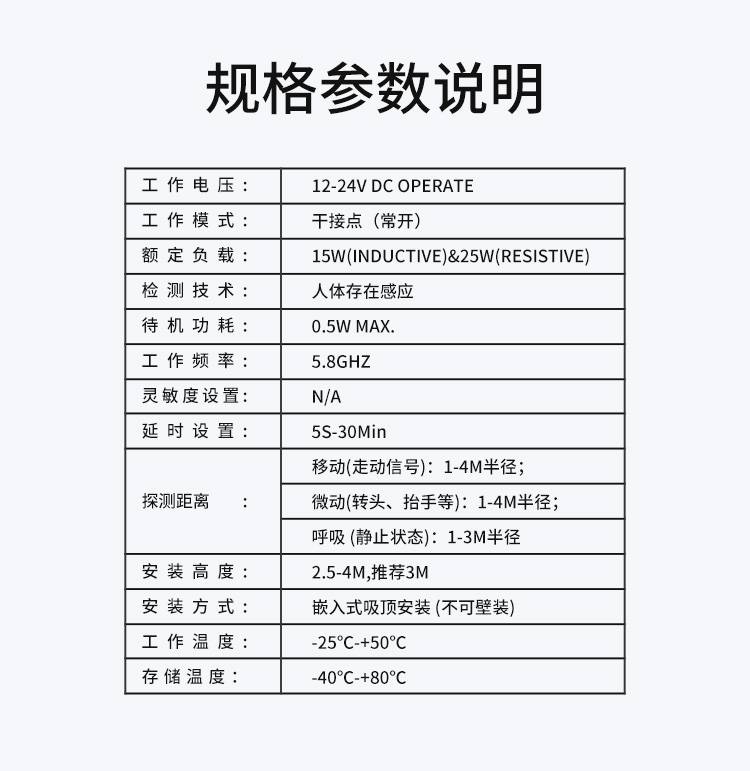 | 特性可进行移动/微动/呼吸混合检测 | 工作温度-25℃~50℃ |